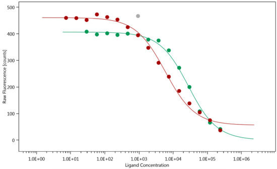 The thermophoretic behavior of full-length Gal3 (Gal3 FL) (Figure 1A) and the carbohydrate recognition domain of Gal3 (Gal3 CRD) (Figure 1D) in the presence of a series of concentrations of Au3+TTPS were recorded, as well as Gal3 FL with roscovitine (Figure 1C). Roscovitine is a small, purine-based inhibitor of cyclin-dependent kinases that is currently being evaluated as a potential drug to treat cancers, inflammation and viral infections [48]. It was however obvious that there is no affinity between Gal3 FL and roscovitine. An initial decay in fluorescence was already observed before thermophoresis, during the capillary scan, for Gal3 FL but even more so for Gal3 CRD (Figure 1). This could potentially be caused by binding of Au3+TTPS too close to the fluorescent labelled lysine, or by its direct interaction with the fluorescent label (NT-647-NHS). To exclude the latter, an SD test that denatures the protein, was performed on Gal3 FL and the same series of concentrations of Au3+TTPS were run without observing binding (Figure 1B), indicating that a labelled lysine was likely present close to the Au3+TTPS binding site.