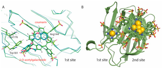 The first two poses that have the most favorable binding energies, of −7971 cal/mol and −7678 cal/mol respectively, superimpose onto the carbohydrate binding site, which we call docking 1st site (Figure 6). Binding of the porphyrin here would block the galectin’s ability to bind carbohydrates (Figure 6A). The next three poses have slightly lower docking energies, from −7436 cal/mol to −6954 cal/mol, and Au3+TPP is docking on a second site of the S-face, on a position that is not involved in carbohydrate analog binding (Figure 6B). The next five poses with even lower energy dock in this same 2nd site.