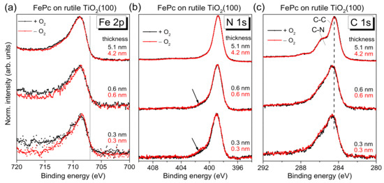 In the following, we discuss how the different preparations of substrate surfaces affect the interaction with organic molecules at the interface. First, we discuss FePc on rutile TiO2(100). The corresponding XPS core-level spectra of the organic molecule are shown in Figure 4 as a function of the film thickness. No significant change of both the peak position and the peak shape of substrate-related core-level peaks (O 1s and Ti 2p, not shown) was visible upon FePc deposition. Black and red curves in Figure 4 correspond to FePc deposited on rutile TiO2(100) prepared in the presence and absence of O2 partial pressure during the last annealing step. The shapes of the spectra for the thickest films are typical for (iron) phthalocyanines and in excellent agreement to the literature [25,26,27,28,29,30]. The Fe 2p spectra show an intensity maximum at a binding energy (BE) of 708.8 eV and exhibit the typical multiplet structure for Fe in FePc (e.g., [25,26,27]). The detailed shape of N 1s and C 1s spectra is described below more in detail based on the respective peak fits. Most important, the black and red curves in Figure 4 are very similar for all core levels, implying that the presence of oxygen during the last annealing step does not affect distinctly the number of reactive defects at the substrate surface. In other words, the absence of oxygen in the last annealing step and the possible formation of surface defects can be obviously compensated, to a large extent, by diffusion of oxygen from deeper layers of the substrate.
