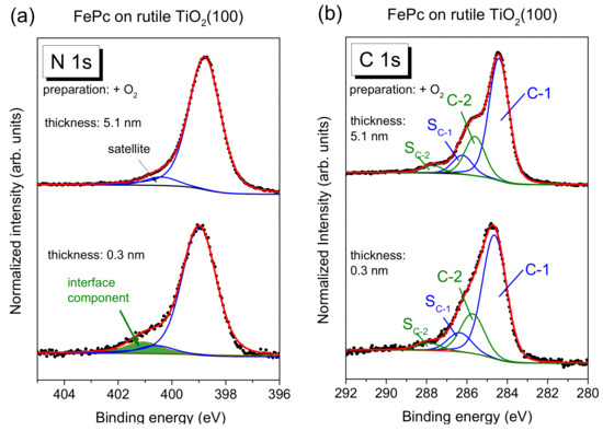 The main line of the N 1s spectrum contains contributions from two types of chemically inequivalent nitrogen atoms in the FePc molecule (cf. Figure 1c), which cannot be resolved experimentally due to their small separation of about 0.3 eV [26]. The main line is accompanied by weaker shake-up satellite features, the most intense satellite appears at about 1.7 eV higher binding energy (e.g., [26,28]). For the bulk-like, 5.1 nm thick FePc film on rutile TiO2(100) prepared in the presence of oxygen during the last annealing step, we find the peak maximum of the main component at 398.8 eV and the satellite at BE = 400.4 eV. At the interface, the N 1s spectrum is shifted slightly by 0.2 eV towards higher binding energies, and the additional intensity can be described by a single peak at 2.05 eV higher binding energy with respect to the main peak. The relative intensity of the interface component is about 7%. In this fitting model, a change of the satellite intensity at the interface is neglected; a distinct suppression is, in particular, observed for organic molecules on metal surfaces [11,31,32,33]. This low relative intensity of the interface component may indicate that only few molecules at the interface become affected by an interaction involving the nitrogen atoms (e.g., molecules adsorbed at defect sites), and/or that a local interaction occurs involving particular nitrogen atoms of FePc.