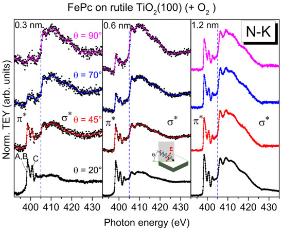 At low coverages (0.3 and 0.6 nm), the spectra at normal emission in Figure 6 are dominated by excitations into σ*-orbitals (photon energies >405 eV), whereas at grazing incidence, the strongest transitions are observed into π*-orbitals (photon energies <405 eV). This indicates a preferred flat lying orientation of the FePc molecules, enabling a maximal interaction of the π-conjugated system with the substrate surface. Such growth modes were observed for low coverages in the monolayer range, if the molecule–substrate interaction is stronger than the molecule–molecule interaction [38]. In contrast, the N-K edge spectra of the 1.2 nm thick FePc film are almost independent of the angle of incidence of the synchrotron light: Both excitations into σ*- and π*-orbitals are visible. This indicates a change of the molecular orientation with increasing thickness. We note, that N-K XAS spectra of thicker FePc films on rutile TiO2(110) show even an anisotropy, where spectra at grazing incidence are dominated by σ*-excitations, while the spectra at normal incidence are dominated by π*-excitations, pointing to a change of the molecular orientation from preferred flat lying to preferred standing (Figure S4). Such a change of the molecular orientation as a consequence of the interplay between molecule–substrate and molecule–molecule interactions was observed for related phthalocyanines on substrates where atomically flat terraces are small or on oxidic substrates (with supposed smaller surface energies), including TiO2 [38,39].