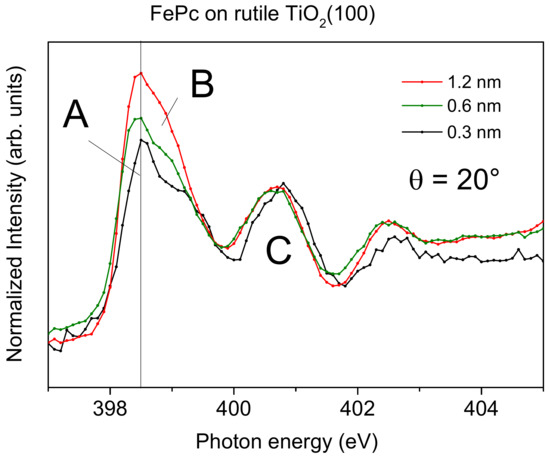 However, not only the (relative) intensity of transitions into π*- and σ*-orbitals change in the N-K XAS spectra of Figure 6. The N-K XAS spectra for the bulk-like 1.2 nm thick FePc film exhibit the typical shape observed for many phthalocyanines. The most intense π* resonances at the lowest photon energies can be assigned to transitions from N 1s to LUMO eg orbitals [40] (denoted A, B in Figure 6). The hybridization with the central metal, most evident for transition metals with not fully occupied lower d-levels (eg), causes a distinct splitting into two features A and B (cf. Figure 7), involving excitations from the two inequivalent nitrogen atoms [13,40,41]. Also, the feature C at higher photon energies in Figure 6 can be essentially assigned to transitions into π* states [40]. Since all features, A, B, and C in Figure 6, are related to transitions into the LUMO orbital, only minor changes of the relative intensities are expected as a function of the angle of the incoming synchrotron light and/or the film thickness. However, as clearly visible in Figure 6, the relative intensity of feature A appears to be decreased for low coverages compared to the 1.2 nm thick film. This becomes more evident in Figure 7, where we zoom into the region of LUMO transitions (A, B, C) for films of different thicknesses measured at grazing incidence (with strongest π* resonances for flat lying molecules). Normalizing the data to the same intensity of feature C, one can clearly see the decreased relative intensity of A and B with respect to C for decreasing coverages.