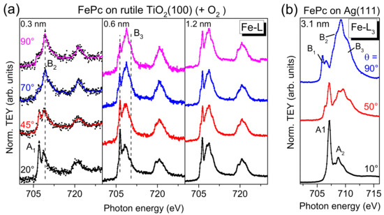 In Figure 9a, a clear angular dependence of the spectral shape is visible in the spectra for low FePc coverages (0.3 and 0.6 nm) on rutile TiO2(100). The missing anisotropy of the spectra for the 1.2 nm film is due to an absence of a preferred molecular orientation at this film thickness (cf. discussion of N-K XAS spectra). In agreement with the degree of orientation obtained from N-K XAS spectra, the anisotropy is stronger for 0.3 nm compared to 0.6 nm. Most important, the monolayer spectra does not exhibit additional or shifted features as observed for strongly interacting systems, such as FePc on Ag(111) [25] or FePc on MnO [27], in good agreement with the discussion of Fe 2p PES spectra above. Such strong interactions can include a hybridization of Fe and substrate-related states and a redistribution of electrons at the Fe atom [13,25,27]. However, the feature denoted “A1” for the 0.3 nm spectrum at grazing incidence seems to exhibit a distinctly lower relative intensity compared to the reference spectra (FePc on Ag(111)), which cannot be understood alone by a slightly different molecular orientation (obtained from N-K XAS spectra) or by the different grazing incidence angle (20° and 10° with respect to the substrate surface in Figure 9a,b, respectively). This may point to a partial filling of the orbitals involved into these transitions due to weak interaction with the substrate or to a minor change of the electronic configuration of the Fe ion at the interface.