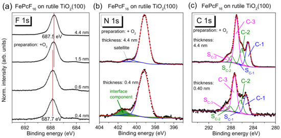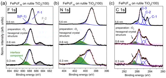 Analogously to N 1s, the peak fit of F 1s spectra reveals an interface component at higher binding energy with respect to the main peak (green component in Figure 13a). In addition, an interface component is visible at about 685 eV in Figure 13a (gray). The binding energy of this component in the range of Ti-F surface fluorides [57,58]. Therefore, the presence of this component may indicate the breaking of some C–F bonds of FePcF16 at the interface and the formation of new bonds with the TiO2 substrate. As a consequence, a covalent bond between the phthalocyanine and the substrate or a new C–H bond might be formed.