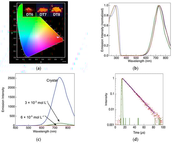 (a) Photograph of crystals taken under UV irradiation at 254 nm using a handheld lamp, and CIE (Commission Internationale de l’Éclairage) chromaticity diagram of the photoluminescence of the crystals: ●, DT6; ▼, DT7; ■, DT8. (b) Photoluminescence (solid line) and excitation spectra (dotted line) of the crystals of DTn at room temperature in air (red: DT6, green: DT7, blue: DT8). The excitation wavelength (λex) was 280 nm for the luminescence spectra, and the luminescence was monitored at their λmaxlum for the excitation spectra (Table 1). (c) Photoluminescence spectra of DT6 in crystalline form and in hexane solutions (λex = 280 nm). Concentrations of the hexane solutions are indicated in the Figure. (d) Decay profile of the luminescence of the DT6 crystal at 733 nm at ambient temperature (λex = 330 nm; pulse width = 600 ps): red, observed luminescence decay; blue, fitting curve; green, instrument response function.