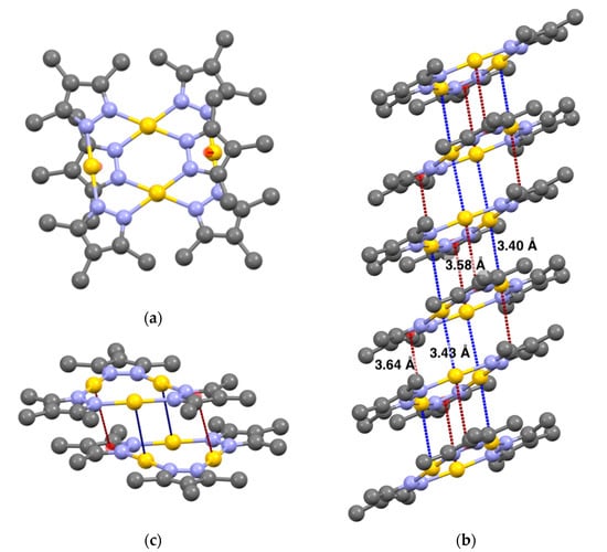 - White-Morris, R.L.; Olmstead, M.M.; Attar, S.; Balch, A.L. Intermolecular Interactions in Polymorphs of Trinuclear Gold(I) Complexes: Insight into the Solvoluminescence of AuI3(MeN=COMe)3. Inorg. Chem. 2005, 44, 5021–5029. [Google Scholar] [CrossRef] [PubMed]