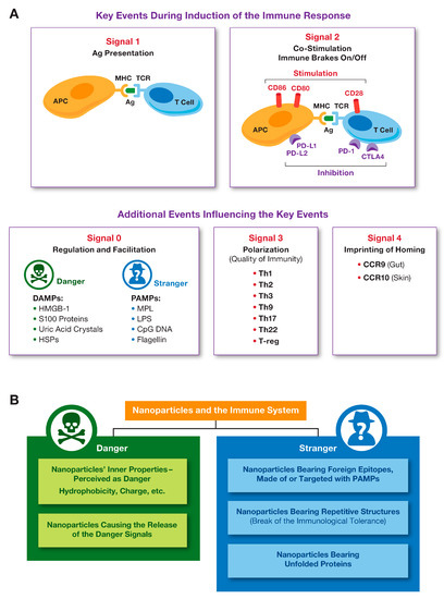 Key events during the induction of the immune response, and the role of nanoparticles in the immunity. (A) The two key events and other prerequisites of the optimal immune response are highlighted. The stimulation signal is provided through the interaction between co-stimulatory molecules (CD80, CD86) on the APC surface and CD28 on the T-cell surface; the inhibition occurs when PD-1 on the T-cell interacts with PD-L1 on the APC, or when CTLA4 on the T-cell interacts with CD80 and CD86 on the APC. (B) Nanoparticles can be perceived as either stranger or danger by the immune cells, depending on their physicochemical properties, cargo, and external environment (e.g., protein corona), which is also determined by the particle’s PCP.