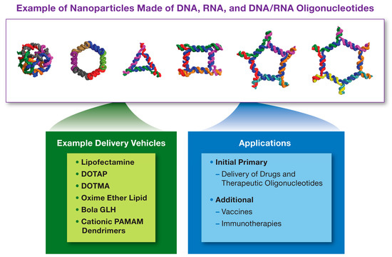 Nucleic Acid Nanoparticles. Nucleic Acid Nanoparticles (NANPs) are made of DNA, RNA or hybrid DNA/RNA oligonucleotides, which assemble into nanostructures with different sizes, geometric shapes, sequence complementarities, and other functional modalities. Some examples of NANPs are shown above. The examples of platforms used to deliver NANPs to cells and tissues are listed in the green box, while their applications in pharmaceutical field are summarized in the blue box. DOTAP = 1,2-Dioleoyl-3-trimethylammonium propane; DOTMA = N-[1-(2,3-dioleyloxy)propyl]-N,N,N-trimethylammonium chloride; PAMAM = polyamidoamine; GLH = bolaamphiphiles.
