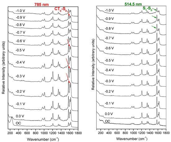 Electrochemical SERS of bpyvn recorded at different electrode potentials by using 785 nm and 514.5 nm can be compared in Figure 2. It can be seen that both series of spectra show the same main bands as those recorded in the Raman spectrum. No bands due to original reagents used in the synthesis or subproducts of other chemical reactions were detected, even at the low concentration of sample in the spectroscopic experiments (10−4 M).