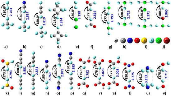 For the (SOF2)2 and (FCOOH)2 dimers (Figure 2k,q), as well as a few others in Figure 2, the ∠Y′···X′–R′ angle deviates slightly from 180°. These are examples of dimer systems that do not involve secondary interaction between the interacting monomers, yet the intermolecular interaction is quasi-linear. In these, the regions associated with the two negative σ-holes on the fluorine atoms in the two different molecules are involved in an attractive engagement, providing stability to the resulting complexes. The deviation of the angle of approach from linearity in these might be an indication of the presence of a lump-hole interaction. This has explained the stability of a nearly slipped parallel (HBr)2 dimer [57] in which the Br···Br intermolecular interaction was the result of an attractive interaction of a lump in the Br atom of one HBr molecule with the hole on Br in the other HBr molecule.