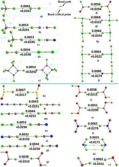 The QTAIM molecular graphs of the 22 energy-minimized dimer geometries are shown in Figure 3. As noted in the Computational details section, the combination of the (3,−1) bcps and the bond paths determines the molecular graph. The (3,−1) bcp is a saddle point of charge density ρ(r) [61], and is a measure of bond strength [116]. Tognetti et al. have provided convincing arguments to show that bond paths are valuable indicators of bonding interactions and have provided explanations for the occasions where they disappear [81,82,83,84,85,86].