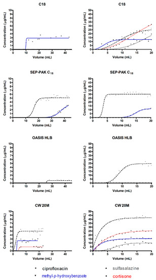 The stock solutions of chemical standards were made at the concentration of 1 mg/mL in the appropriate solvent, referring to solubility tests: ciprofloxacin was solubilized in a mixture MeOH: HCl (0.1 M) 1:1 (v/v), sulfasalazine in DMSO, methyl-p-hydroxybenzoate and cortisone in MeOH. The combined working solutions (at the concentration of 10 and 50 μg/mL) were prepared by dilution of a mixed solution in MilliQ water. The resulting samples were used to evaluate the enrichment factors, breakthrough volume, retention volume, hold-up volume, retention factor, and theoretical plate number.