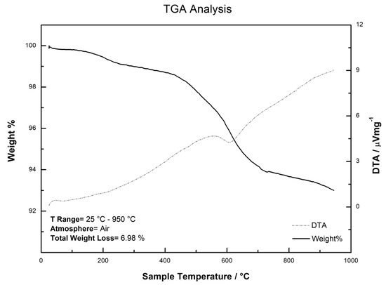 FTIR spectroscopy was conducted on a Perkin-Elmer spectrum TWO instrument, operating in Attenuated Total Reflectance (ATR) mode in the 4000 cm−1–450 cm−1 wavenumber range. Thermogravimetric analysis was carried out using a Netzsch Regulus 2500 thermobalance, in air atmosphere, in the 25–950 °C temperature range.