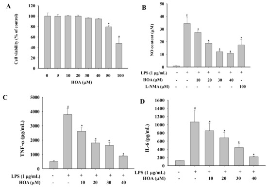 RAW264.7 macrophage cells were seeded in 96-well plate at a concentration of 1 × 106 cells/mL (100 μL/well) and 18 h. RAW264.7 cells pretreated with HOA or l-NMMA for 30 min were incubated with LPS (1 µg/mL) for 24 h. The NO content was determined by Griess reagent as described previously [59]. The secretion of TNF-α and IL-6 was measured using the flow cytometry (C6 Plus, BD Sceinces, Sparks, MD, USA), according to the manufacturer’s guidelines.