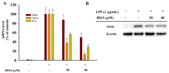 To further determine whether HOA-mediated inhibition of inflammation was involved in the modulation of the inducible NO synthase (iNOS), IL-6, and TNF-α gene expression at the transcriptional level, RAW264.7 cells were pretreated with different concentrations of HOA for 30 min and stimulated with LPS (1 µg/mL) for 6 h and analyzed by reverse-transcription polymerase chain reaction (RT-qPCR). As shown in Figure 4, RT-qPCR revealed that iNOS, IL-6, and TNF-α mRNAs expression levels were low in unstimulated RAW264.7 cells. However, mRNA expression levels were sharply increased by LPS treatment and significantly inhibited by HOA treatment except iNOS expression at 20 μM. Furthermore, western blot was carried out to confirm that iNOS expression was significantly inhibited both at 20 and 40 μM. These results suggest that the inhibitory effect of HOA on iNOS, TNF-α, and IL-6 secretion following LPS stimulation is attributable to downregulation of expression of iNOS, TNF-α, and IL-6.