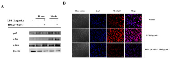 Effect of HOA on translocation of transcription factors in LPS-induced RAW264.7 cells. (A) Cells were plated at a density of 5 × 106 cells/dish in 60-mm culture dishes and treated with LPS and HOA for indicated time points. After preparation of the nuclear fraction, the protein expression levels of p65, c-Jun, and c-Fos were measured. (B) The localization of NF-κB p65 in the cytoplasm and nuclear were visualized by a confocal microscopy.