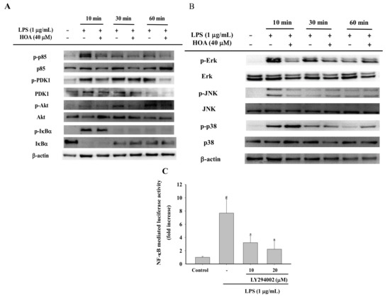 Effects of HOA on LPS-induced activation of PI3K/Akt and MAPKs signaling pathways. (A) Cells were plated at a density of 5 × 106 cells/dish in 60-mm culture dishes and treated with LPS and HOA for indicated time points. After preparation of the total protein, the phosphorylated and total forms of PDK1, p85, and Akt were measured by western blot. (B) Cells were plated at a density of 5 × 106 cells/dish in 60-mm culture dishes and treated with LPS and HOA for indicated time points. After preparation of the total protein, the phosphorylated and total forms of ERK, JNK, and p38 were measured by western blot. (C) Inhibitory effects of LY294002 on LPS-induced NF-κB-luc activity in RAW264.7 cells. Results are representative of three experiments. * indicates a significant difference between LPS group and LY294002 + LPS groups (p < 0.05). # indicates a significant difference between LPS group and the control group (p < 0.05).