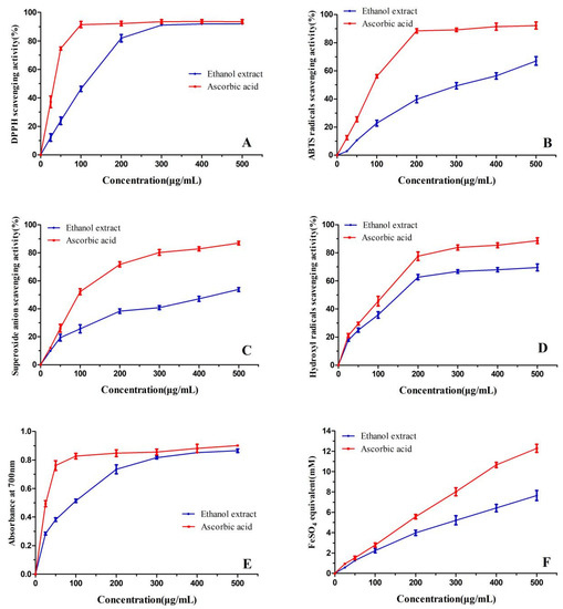 The DPPH free radicals have been extensively used to investigate the scavenging activity of natural antioxidants. Figure 2A shows the results of the scavenging DPPH radical activity of T. ramosissima bark extracts. The scavenging activity increased sharply when the concentration increased from 25 to 200 μg/mL and trended towards a plateau after 300 μg/mL (91.70% ± 0.78), at which maximal scavenging activity on the DPPH radicals was reached. There was no significant difference of the scavenging activity between the bark extract groups and the control (ascorbic acid) (p > 0.05) at concentrations of more than 200 μg/mL. There was also no significant difference among the concentrations of 300, 400, and 500 μg/mL of the bark extract groups (p > 0.05). The IC50 value (117.05 μg/mL) of T. ramosissima bark extract for scavenging activity against DPPH was much higher than the results of Ksouri et al. [5], who found that the IC50 values on the DPPH radical of the T. gallica flower and leaf extracts were 2 and 9 μg/mL, respectively, due to the structural conformation of the antioxidants. In the main polyphenols of the T. gallica flower and leaf extracts, the second hydroxyl group of gallic, chlorogenic, and rosmarinic acid and catechin were in the ortho position, while the compounds of sinapic, syringic, vanillic, and ferulic acid had ortho-methoxy substitutions. These compounds in the flower and leaf extracts included a second hydroxyl group in the ortho or para position, and the ortho-methoxy substitution group increased antioxidant efficiencies [16]. However, isorhamnetin and hispidulin in the bark extract had the second hydroxyl group in the meta position. This is potentially the reason for the lower scavenging activity on the DPPH radicals compared to the results of Ksouri et al. [5].
