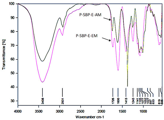 FTIR spectra of sugar beet pulp pectin. P-SBP-E-AM: pectin of sugar beet pulp ensiled, extracted by acid method. P-SBP-E-EM: pectin of sugar beet pulp ensiled, extracted by enzymatic method.