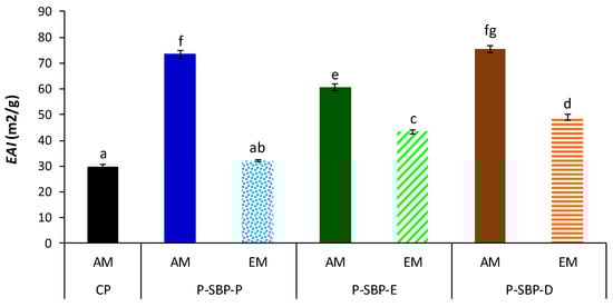 Emulsifying activity index (EAI) of pectin obtained from sugar beet by-products by acid or enzymatic methods. CP: citrus pectin. P-SBP-P: pectin of sugar beet pulp pressed, P-SBP-E: pectin of sugar beet pulp ensiled, P-SBP-D: pectin of sugar beet pulp dried. AM: Acid method. EM: Enzymatic method. Different letters (a–d) in the columns denote significant difference (p < 0.05).