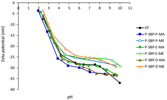 Zeta potential (ζ) curves of pectin. CP: citrus pectin. P-SBP-P-AM: pectin from sugar beet pulp pressed, acid method; P-SBP-P-EM: pectin from sugar beet pulp pressed, enzymatic method; P-SBP-E-AM: pectin from sugar beet pulp ensiled, acid method; P-SBP-E-EM: pectin from sugar beet pulp ensiled, enzymatic method; P-SBP-D-AM: pectin from sugar beet pulp dried, acid method; P-SBP-D-EM: pectin from sugar beet pulp dried, enzymatic method.