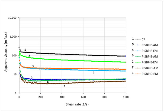Apparent viscosity of pectin solutions (20 mg/mL). CP: citrus pectin. P-SBP-P-AM: pectin of sugar beet pulp pressed, acid method. P-SBP-P-EM: pectin of sugar beet pulp pressed, enzymatic method. P-SBP-E-AM: pectin of sugar beet pulp ensiled, acid method. P-SBP-E-EM: pectin of sugar beet pulp ensiled, enzymatic method. P-SBP-D-AM: pectin of sugar beet pulp dried, acid method. P-SBP-D-EM: pectin of sugar beet pulp dried, enzymatic method.