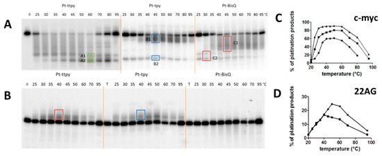 Since all these complexes (except for Pt(PA)-tpy) are susceptible to induce platination reactions, they can be exacerbated by a high temperature and by an increased number of nucleophilic sites which are exposed during unfolding (increased N7 G free sites); we wonder if such a reaction could occur during FRET-melting experiments and to what extent. Therefore, we followed the extent of platination reactions of c-myc and 22AG (same sequences as those used for FRET-melting but without fluorophore labeling) as a function of the melting temperature using 32P-labelled oligonucleotides and denaturing gel electrophoresis (Figure 2). Pt-ttpy, Pt-tpy, and Pt-BisQ clearly platinate c-myc and 22AG (except for Pt-BisQ) during melting temperature experiments and the extent of platination depends both on the sequence (c-myc (60%) > 22AG (20%)) and on the complex (Pt-ttpy > Pt-tpy > Pt-BisQ). These results suggest that these platination reactions may therefore bias the melting temperature value. Pt-ctpy, Pt-vpym, and Pt-cpym do not give any defined platination product, and thus, they were not evaluated in this melting temperature condition (see Section 2.3. Quadruplex Platination).