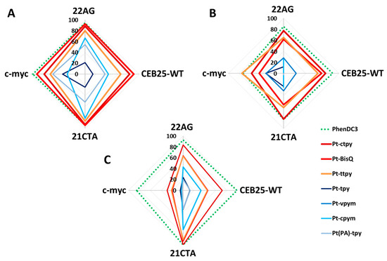 The radar plot representing the percent of the probe displacement at 1 µM of the Pt(II) complexs (Pt-ctpy, Pt-BisQ, Pt-ttpy, Pt-tpy, Pt-vpym, Pt-cpym, and Pt(PA)-tpy) and the PhenDC3 used as control for the G4-FID assay. The experiments are performed in the presence of 22AG, c-myc, 21CTA, and CEB25-WT with (A) Thiazole Orange (TO) (2 eq.), (B) TO-PRO-3 (2 eq.), or (C) Phen DV (1.5 eq.) in K+100 buffer. The values are given in Tables S2–S4.