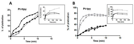 When adding an excess of duplex DNA (ds26) as a competitor, neither the amount of platinated products nor platination kinetics are affected. In contrast, when c-myc was added as a competitor, the platination kinetic of ds26* was affected. These results confirm the high selectivity of the platination reaction performed by Pt-ttpy with G4 DNA structures.