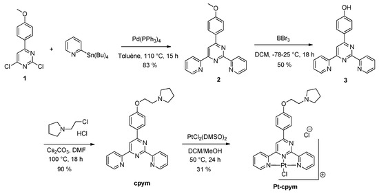 We changed the central pyridine of the terpyridine to a pyrimidine obtaining compounds Pt-cpym and Pt-vpym. The ligand cpym was prepared by a three-step synthesis starting from the already described pyrimidine 1 (Scheme 2) [49].
