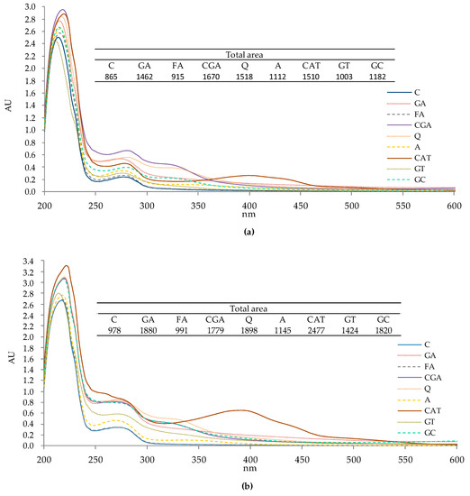 UV-Vis spectra of protein–phenolic complexes. (a) albumins; (b) globulins. C–control sample, GA, FA, CGA, Q, A, CAT, GT, GC–protein samples after incubation with gallic acid, ferulic acid, chlorogenic acid, quercetin, apigenin, catechin, green tea, and green coffee extracts, respectively.