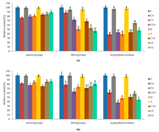 In case of albumins (Figure 2a), the most significant decrease in the amount of free amino groups was determined for GA (decrease by 23% in comparison to control). The highest negative impact on the abundance of free thiol groups was noticed for GC (decrease by 53%). However, there were no significant differences among GT, Q, and GC. The relative content of free tryptophan residues decreased significantly up to 62% after incubation with GA, and a similar impact was determined for Q, CGA, and CAT with which it decreased by 61%, 57%, and 57%, respectively.