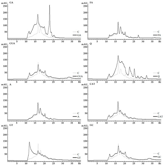 The effect of phenolic compounds on the SE-HPLC elution profiles of albumins and globulins is shown in Figure 3 and Figure 4, respectively. The results for albumins show that the chromatogram areas of proteins treated with phenolics were larger than those in the control sample (Figure 3). This effect was particularly pronounced for GA and Q complexes. Furthermore, changes in the size, shape, and retention time (Rt) of some individual peaks as well as the appearance of new peaks as a consequence of the addition of phenolics were found. An increase of individual peak size and a decrease of Rt compared to the control was determined for GA (e.g., peaks with Rt 16.5 and 23 min) among others. In comparison to the control, the most relevant changes in the shape of the chromatogram were detected for the GT sample—there was a significant increase of absorbance areas toward the lower Rt (10–16 min), which corresponded to an increase in the ratio of fractions with a higher molecular weight. For the globulin fraction (Figure 4), we found similar observations, such as a significant increase of chromatogram areas (especially for GA, Q, CAT, and GC), only a slight effect of FA and A on the SE-HPLC profile, as well as changes in the size, shapes, and Rt of some individual peaks. Moreover, in the case of the GT sample, an increase of the absorbance areas toward the lower Rt was observed (Figure 4). Furthermore, in the GT sample, some new peaks were noticed (e.g., for CGA and CAT samples, peaks with Rt 18 min).
