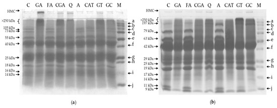 The effect of phenolic compounds on the SDS-PAGE profile of: (a) albumins; (b) globulins. C–control sample, GA, FA, CGA, Q, A, CAT, GT, GC–protein samples after incubation with gallic acid, ferulic acid, chlorogenic acid, quercetin, apigenin, catechin, green tea, and green coffee extracts, respectively; M–molecular weight markers: a (250 kDa), b (150 kDa), c (100 kDa), d (75 kDa), e (50 kDa), f (37 kDa), g (25 kDa), h (20 kDa), i (15 kDa), j (10 kDa); HMC (high molecular complex).
