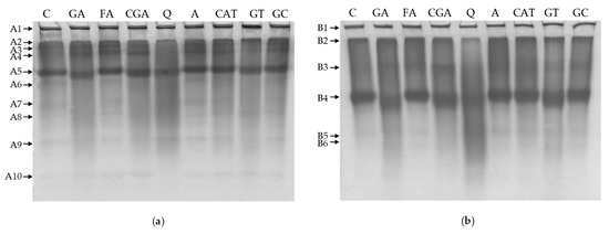 The effect of phenolic compounds on the Native-PAGE profile of: (a) albumins; (b) globulins. C–control sample, GA, FA, CGA, Q, A, CAT, GT, GC–protein samples after incubation with gallic acid, ferulic acid, chlorogenic acid, quercetin, apigenin, catechin, green tea, and green coffee extracts, respectively; A1–A10: bands detected for albumins, B1–B5: bands detected for globulins.