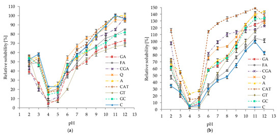 Relative solubility of white bean proteins affected by phenolic compounds at different pH values: (a) albumins; and (b) globulins. Points represent means (n = 3) ± SD. C–control sample, GA, FA, CGA, Q, A, CAT, GT, GC–protein samples after incubation with gallic acid, ferulic acid, chlorogenic acid, quercetin, apigenin, catechin, green tea, and green coffee extracts, respectively.