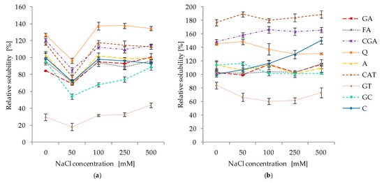 The effect of ionic strength on the solubility of protein–phenolic complexes is presented in Figure 8. As expected, the incorporation of phenolic compounds into proteins influenced solubility at different ionic strengths. In case of albumins (Figure 8a), for all samples, the lowest solubility was determined at a slight ionic strength (50 mM NaCl), which was significantly lower than that at other ionic strengths (0 mM NaCl, 100–500 mM NaCl). In the case of C, FA, A, and CAT samples, an increase of ionic strengths in the range of 100–500 mM NaCl had no significant effect on further protein solubility changes. However, in the abovementioned range for CGA and GC samples, a significant decrease in solubility was determined in comparison to native conditions (0 mM NaCl). In contrast, the solubility of GA, Q, and GT increased in the range of 100–500 mM NaCl. Among all of the samples, the lowest solubility was noticed for GT, especially for the sample treated with 50 mM NaCl, where it was only 18% of that recorded for the control sample under native conditions. Nevertheless, a further increase of ionic strength (100–500 mM NaCl) resulted in an increase in the GT solubility of up to 43% of that for the control sample. Among all of the samples, the highest solubility was determined for Q, where it was higher by up to 34% that was noticed in the presence of 250 mM NaCl.
