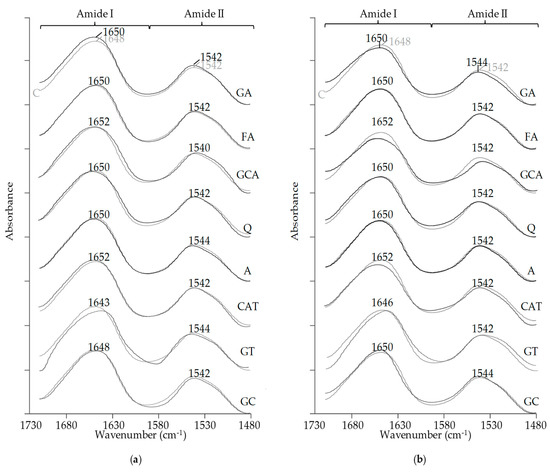 The effect of phenolic compounds on the FT-IR spectra absorbance at regions associated with amides I and II: (a) albumins; and (b) globulins. C–control sample (grey line), GA, FA, CGA, Q, A, CAT, GT, GC–protein samples after incubation with gallic acid, ferulic acid, chlorogenic acid, quercetin, apigenin, catechin, green tea, and green coffee extract, respectively.
