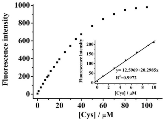 We tested the sensitivity of probe 1 (5.0 μM) toward Cys. Upon addition of Cys (0.0~100.0 μM), fluorescent intensity at 530 nm gradually increase with the concentration of Cys. The change in fluorescent titration spectra terminated when the concentration of Cys reached 100.0 µM. At such concentration, the fluorescence intensity became about 148-fold higher than the baseline with no Cys (Figure 2).