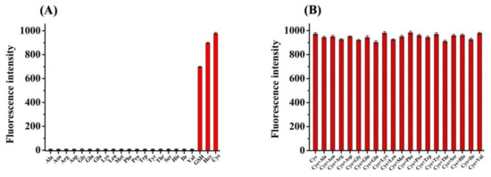 To investigate the selectivity performance of probe 1 (5.0 μM) for biothiols, biologically relevant compounds (100.0 μM), including Ala, Asn, Arg, Asp, Gly, Gln, Glu, Lys, Leu, Met, Phe, Pro, Trp, Tyr, Thr, Ser, His, Ile, Val, GSH, Hcy, Cys, KCl, NaCl, MgCl2, CaCl2, ZnCl2, FeCl3, Na2SO4, NaSCN, AcONa, Na2CO3, NaNO3, Na3PO4, NaNO2 and H2O2 were examined. As a result, only biothiols (Cys, GSH and Hcy) elicited a significant fluorescence enhancement of probe 1, whereas representative amino acids, typical biological ions and molecules had no response towards probe 1 (Figure 4A and Figure S5). Moreover, competitive assays indicated that probe 1 still retained sensing biothiols in the presence of representative amino acids, typical biological ions and molecules (Figure 4B and Figure S6). These phenomena confirmed that probe 1 had highly selective for biothiols over other competitive species under physiological conditions.