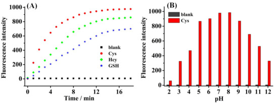 (A) Time-dependent fluorescence intensity of probe 1 (5.0 μM) at 530 nm reacted with 100.0 μM for Cys, Hcy, GSH in the solution containing PBS buffer (pH = 7.4, 50.0 mM) and 20% of DMSO. (B) pH effect on the fluorescence intensity of only probe 1 (5.0 μM) (black) and in the presence (red) of Cys (100.0 μM) at 530 nm (λexc = 413 nm, and t = 15 min).