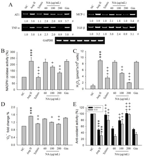 Effects of the natural product mixture (No-ap, NA) on the expression of hypertension-related molecules or oxidative stress in the Ang II-stimulated H9C2 cells. H9C2 cells (1 × 106 cells) were stimulated with 300 nM Ang II for 7 h. No-ap (NA), telmisartan (Telmis), or ginsenoside (Gin) were administered 1 h before Ang II stimulation. The expression of AT1, TNF-α, MCP-1, TGF-β was determined in mRNA extracts isolated from H9C2 cells using RT-PCR. The activity of NADPH oxidase, catalase, and SOD, and the amounts of H2O2 and •O2− were determined in cell lysates isolated from H9C2 cells using an ELISA kit. The reactions were analyzed using an ELISA plate reader at 450 nm for the activities of NADPH oxidase and SOD and •O2− amounts, and at 590 nm for H2O2 amounts and catalase activity. (A) Expression of AT1 and cytokines. (B) Activity of NADPH oxidase. (C) Amounts of H2O2. (D) Amounts (fold change %) of •O2−. (E) Activities of catalase and SOD. #, Numbers below the band images, indicating the mean values (n = 4 independent experiments) obtained from the ratio of the band density of each group to those of the corresponding controls and loading control GAPDH. The results represent the mean ± SEM (n = 4) obtained from four independent experiments performed in triplicates. NC, negative control; Ang II, angiotensin II stimulation; AT1, angiotensin II receptor 1; TNF-α, tumor necrosis factor-α; MCP-1, monocyte chemoattractant protein-1; TGF-β, tumor growth factor-β; NADPH, nicotinamide adenine dinucleotide phosphate; H2O2, hydrogen peroxide; •O2−, superoxide anion; SOD, superoxide dismutase. ***, p < 0.001 versus the NC. +, p < 0.05; ++, p < 0.01; +++, p < 0.001 versus the Ang II stimulation.