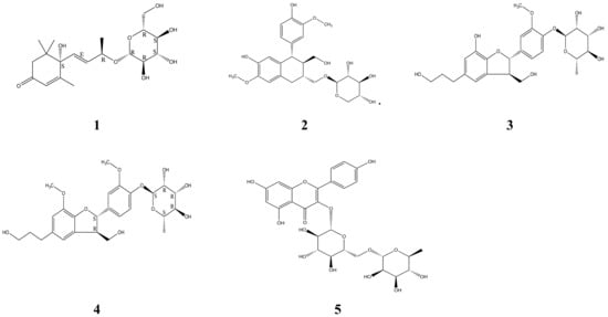 As a natural product mixture, NA contains P. densiflora (75.0%), A. muricata (12.5%), M. charantia (12.5%). NA was extracted with methanol and successively partitioned with ethyl acetate and n-BuOH to afford ethyl acetate, n-BuOH, and water fractions. The n-BuOH fraction was subjected to silica gel and YMC RP-18 silica gel column chromatography, and five compounds (1–5) were identified. Their spectroscopic data and comparisons with previous data confirmed that these compounds were roseoside (1) [24], isolariciresinol 9-O-β-d-xyloside (2) [25], massonianoside B (3) [26], icariside E4 (4) [27], and nicotiflorin (5) [28] (Figure 2, Supplementary Materials Figures S1–S15).