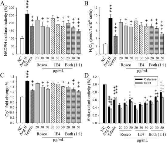 The combination pretreatment of Roseo and IE4 at a ratio of 1:1 (each used at the dose of 25 μg/mL; total dose, 50 μg/mL) reduced the activity of NADPH oxidase and the generation of H2O2 and •O2− in a dose-dependent manner in Ang II-stimulated H9C2 cells. The combination pretreatment increased the activity of catalase or SOD in a dose-dependent manner. Thus, the combination pretreatment of Roseo and IE4 at a 1:1 ratio showed stronger synergistic inhibitory effects on the suppression of oxidative stress and on the increase of anti-oxidant enzyme activities in Ang II-stimulated H9C2 cells, compared to the single components (Figure 4).