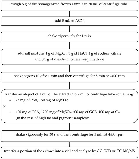 Extractions were performed from frozen samples to minimize possible sensitive pesticide losses due to the heat produced in the sample after salt addition. The 5.0 ± 0.001 mL of ACN was added to the centrifuge tube and then shaken for 1 min. After that, the mixture of salts containing 4 g MgSO4, 1 g NaCl, 1 g sodium citrate and 0.5 g disodium citrate sesquihydrate, was poured and immediately shaken for 1 min, and then centrifuged at 4400 rpm for 5 min. An aliquot of 1.0 ± 0.001 mL of the upper layer (organic phase) was transferred to a 2 mL polypropylene centrifuge tube prefilled with 150 mg of MgSO4 and 25 mg of PSA. Subsequently, it was mixed for 30 s and after that centrifuged at 4400 rpm for 5 min. The clean extract was next transferred to a 1.5 mL glass vial and analyzed by GC-ECD or GC-MS/MS. Samples were normally analyzed by the same day and kept in the fridge when analysis was not running.