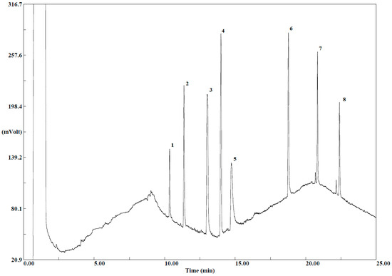 Chromatogram obtained for 10 g of spiked apple sample at the concentration level 2 mg·kg−1 for each pesticide by using QuEChERS-GC-ECD, 1: Tolclofos-methyl, 2: Chlorpyrifos, 3: Captan, 4: α-endosulfan, 5: Imazalil, 6: Phosalone, 7: α-cypermethrin, 8: Deltamethrin.