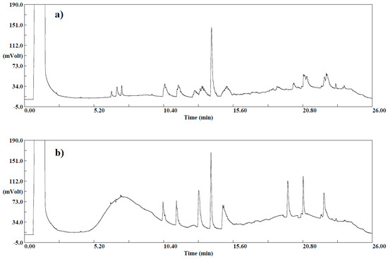 Chromatograms obtained for the extracts from: (a) 5 mL (1:10) of sample solution and (b) 5 g of the original sample by using QuEChERS-GC-ECD.