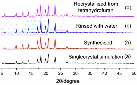 PXRD patterns of CC3-R: (a) Singlecrystal simulation, (b) synthesised, (c) rinsed with water for 48 h, (d) recrystallised from tetrahydrofuran.