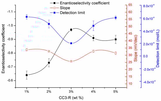 Figure 4 shows the potential response characteristics of membrane electrodes with different CC3-R mass percentages. The performance of the membrane electrode improved with increasing CC3-R content, and the best enantioselectivity toward S-2-amino-1-butanol was achieved with 3% CC3-R (by weight). However, the enantioselectivity and sensitivity decreased slightly when the amount of CC3-R reached 4%. It is possible that the PVC membrane becomes saturated, hence the number of recognition sites does not increase proportionately with the chiral selector. Moreover, excess CC3-R could affect the ion-exchange capacity of the membrane electrode.