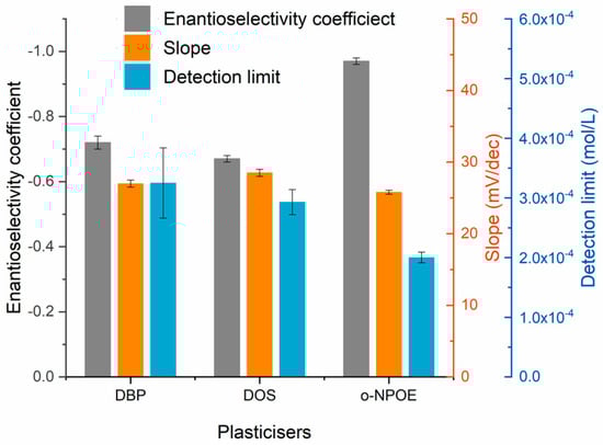 The influence of the type of plasticiser is shown in Figure 5. DOS and DBP were clearly inferior to o-NPOE in terms of detection limit and enantioselectivity coefficient for S-2-amino-1-butanol.